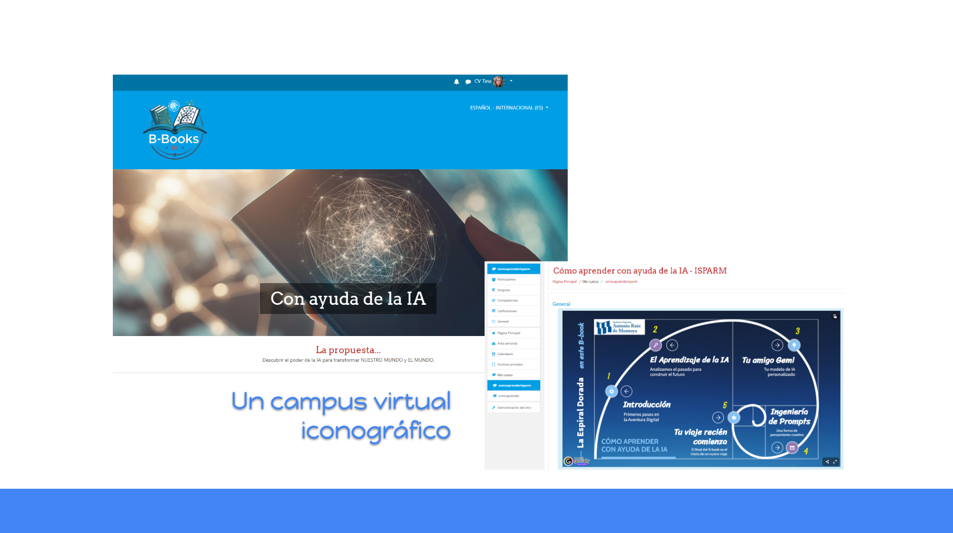 Un Campus Virtual Iconográfico es un entorno de formación digital cuyo diseño se basa en símbolos e imágenes para organizar el contenido, facilitar la navegación y potenciar la comprensión y el autoconocimiento en el proceso de aprendizaje. Utiliza un sistema rico en iconos, gráficos y metáforas visuales (como la «Espiral Dorada» que se ve en la imagen) en lugar de depender únicamente de texto.