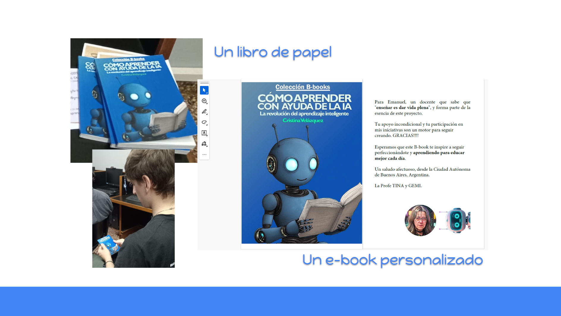 Un libro de papel y un e-book personalizado… para cada uno de los estudiantes en base a sus intereses personales. “Cómo aprender con ayuda de la IA – La revolución del aprendizaje inteligente»: Un recurso donde la IA (como Gemini) actúa como un poderoso socio cognitivo y una herramienta de vanguardia que potencia el aprendizaje, eliminando barreras de acceso para refinar, adaptar y democratizar la comprensión de recursos y contenidos educativos complejos.